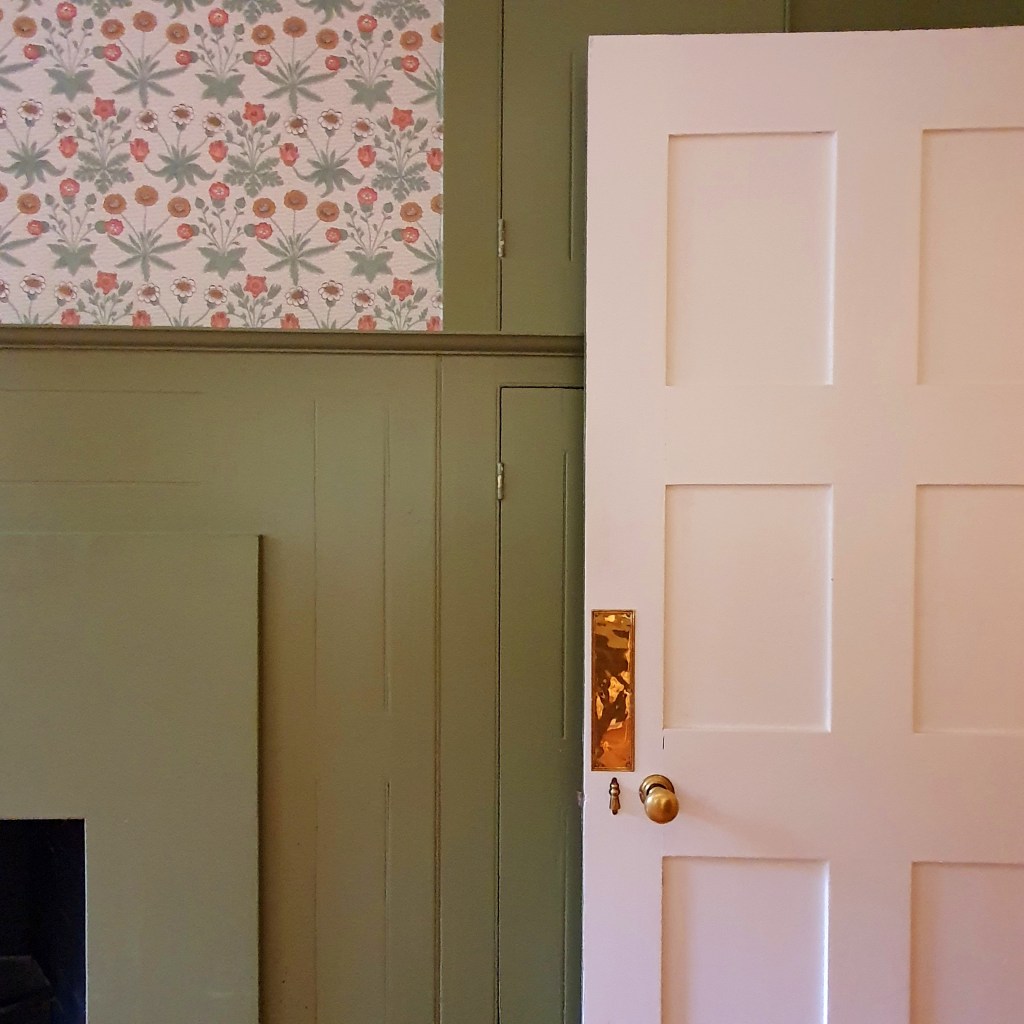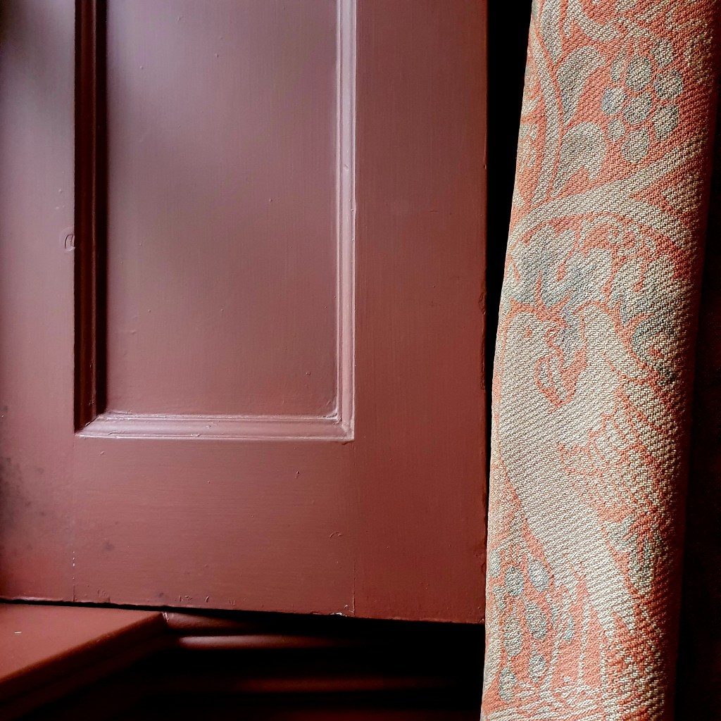 I choose this particular detail for Marian at Standen and its beautifully corresponding elements: on the one hand side, there is the painted wood – a deep, and yet matt red. It’s called Dragon’s Blood. The moulding of the window is being kept simple: straight lines, creating varying shadows and lights throughout the day. And then, just next to it, a thickly woven Morris & Co. curtain fabric in a quite matching colour scheme. Ornamented, but modest. Reminding and connecting you through the pattern on it of and with the outside world – with nature. It is a juxtaposition and strongest, when kept in this rather simple way.