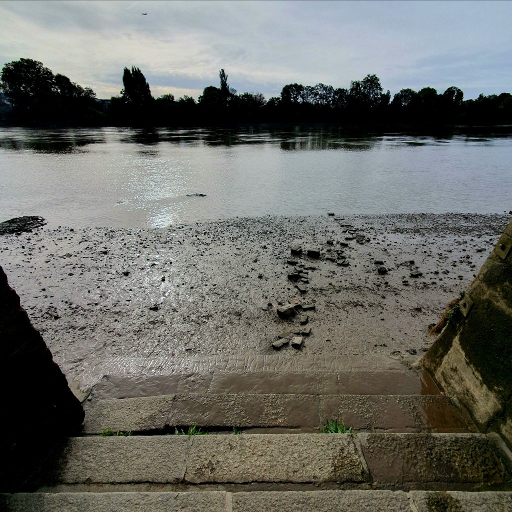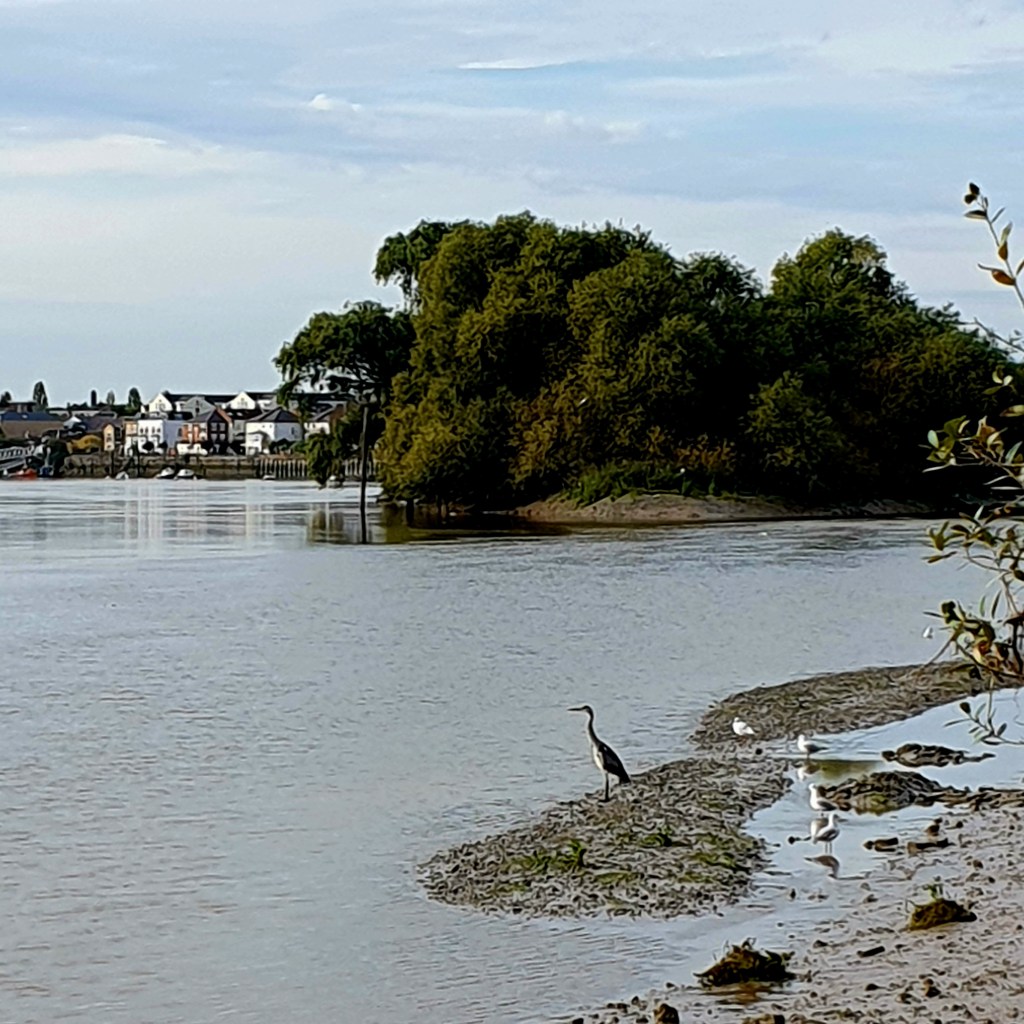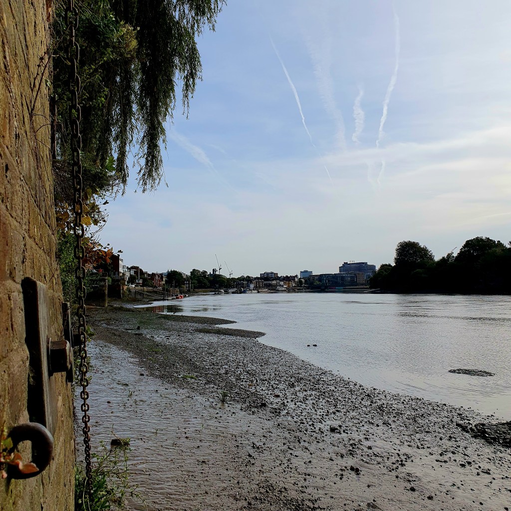 It is late morning just around Hammersmith Terrace at the banks of the river Thames. A harron and some seagulls are engaging in their morning routine next to the ebb tide line. The thin blanket of clouds ​is suggest​ing a promising day.