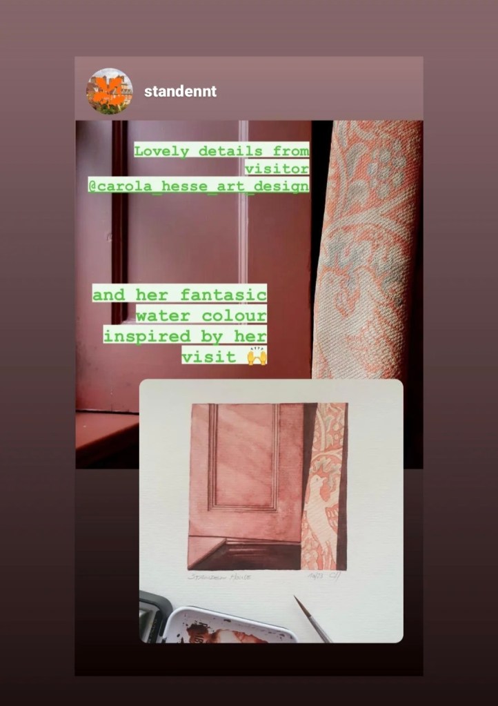 After my visit at Standen House and Garden, I found myself quite inspired and grateful. So I did a small Watercolour Painting of a detail in the Business Room and was then granted the honour of being featured by Standen House for my work on social media. For a self-trained artist that has another full-time employment, and as someone that feels strangely and strongly connected to the Arts and Crafts Movement in many ways, this is an honour indeed! So, Standen and team: for your help with my research on site, an unplanned ride on this incredible ancient country road (I will never forget that either!), and this gesture, I would like to express my heartfelt gratitude.